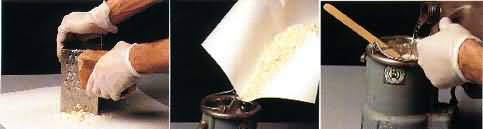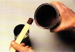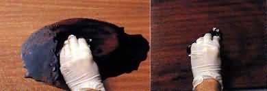 Cera dura teñida: Para obtenerla, la licuaremos calentándola al baño maría (en un recipiente de cristal con la cera, metido dentro de un cazo o una tartera con agua, y ésta al fuego). Para que se derrita antes, podemos laminarla con el formón en hojas finas. Le añadiremos algún tinte que mezcle bien con la cera (pintura al óleo, o betún de judea), en colores oscuros, que nos servirá para emplastecer y restaurar los defectos en la madera. Ésta, si no queréis hacerla, podéis adquirirla en comercios especializados. Viene en barritas de diferentes tonos, aunque muchas tienen siliconas (no nos conviene). Las buenas son más caras (unos 2,50 euros/barra), pero nos ahorran fabricarla nosotros.