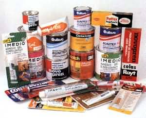 - Colas de caucho sintético o de contacto. Reciben este nombre debido a que para usarlas es necesario aplicar sobre las dos superficies a unir, dejar evaporar los solventes y poner en contacto ambas superficies bajo la acción de un prensado instantáneo. El componente fundamental de este tipo de colas es un caucho sintético conocido como neopreno, aunque tiene más componentes, que hace que varíen bastante las fórmulas de unos fabricantes a otros. Esta cola se aplica preferentemente para el encolado de revestimientos murales de contrachapeado, tableros de fibras o estratificados plásticos, para chapear superficies y cantos y para trabajos que requieran cierta rapidez.