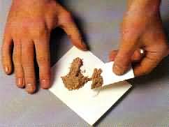 El emplaste es básicamente una pasta que se aplica sobre la grieta, introduciéndola con una espátula. Al secar, endurece y adquiere una textura parecida a la de la madera. La podremos lijar, aunque no es fácil tallarla, por lo que evitaremos modelar con emplaste elementos que tienen que resaltar de la superficie o que haya que retocar con la gubia.