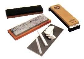 Solo me queda hablar en este apartado de algunas piedras con nombre propio: Para afilar, es suficiente con una piedra de dos caras (gruesa y fina) económica. Se fabrican artificialmente y deben ser lubricadas (siempre recordaré que las piedras no se deben usar nunca en seco), preferentemente con aceite, aunque también puede ser con agua. Sin embargo, para el asentado, debemos usar una piedra de la mejor calidad posible (lo que nuestro bolsillo nos permita), a ser posible natural y de grano finísimo. Aquí tengo que referirme a la famosa piedra blanca de Arkansas. Es una piedra de una calidad extraordinaria, que permite unos acabados perfectos. Su mayor defecto es su precio, que muchos consideraréis excesivo, pero es de lo mejor que he probado. Por menos precio podemos encontrarnos muchas variedades de piedras locales o de importación para asentar. Para asegurarnos de que va a cumplir con su cometido, estudiaremos la textura de la superficie para comprobar su finura (cuanto más suave mejor) y le echaremos encima una gota de aceite. Si la absorbe rápidamente, tiene mucho poro, por lo que la desecharemos como piedra de asentado. Existen buenas piedras de pizarra, pero suelen ser blandas, por lo que se nos gastaría y deformaría enseguida. En este punto ya sólo os puedo recomendar acceder a la experiencia de algún artesano de la zona. Es muy posible que conozcan una cantera, o un artesano de la piedra que consigue buen material para nuestros propósitos.