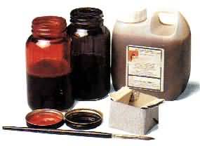 Tintes al agua: se trata de unas sustancias (naturales o artificiales) solubles en agua que nos permitirán teñir nuestros trabajos para dotarlos de mayor realce y calidad. Aquí me gustaría hacer una observación: es muy frecuente que los principiantes no deseen oscurecer mucho sus trabajos de talla y se nieguen a darles color o si se lo dan, muy claro. Con la experiencia, se va cambiando de actitud hacia colores más oscuros, que hacen que la obra parezca tener más relieve, siempre sin caer en una oscuridad excesiva, que desembocaría en el efecto conocido como ebonizado (teñir de negro la madera -con nigrosina- para que parezca ébano).