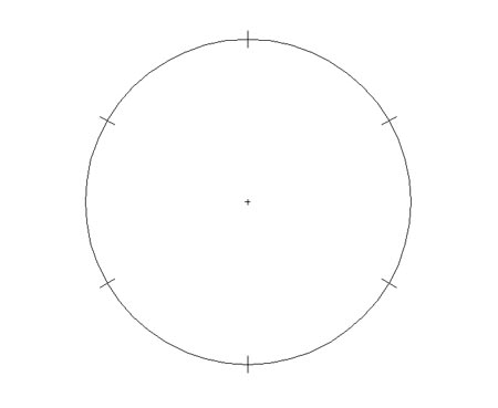 A continuación trazaremos los puntos medios de los anteriores y los uniremos con el centro. Una manera muy cómoda de hacerlo es usando el compás: con una abertura mayor de la mitad de la distancia entre puntos trazaremos dos pequeños arcos desde cada uno de los puntos que tenemos. Donde se cortan esos arcos entre sí, determinan puntos equidistantes a los usados, que podremos directamente unir con el centro de la circunferencia. El resultado debería ser, aproximadamente: