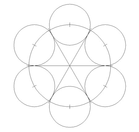 Partimos de una circunferencia base (no la traces muy fuerte con el lápiz porque luego la tendremos que borrar). Marcaremos el centro y la dividiremos en seis partes iguales. Te recuerdo que la distancia que tenemos que tomar para obtener un sexto de la circunferencia es igual al radio, por lo que nos bastará mantener la abertura del compás y marcar consecutivamente las seis partes. Es conveniente empezar en la vertical, para que el dibujo nos salga derecho. Deberíamos tener algo así: