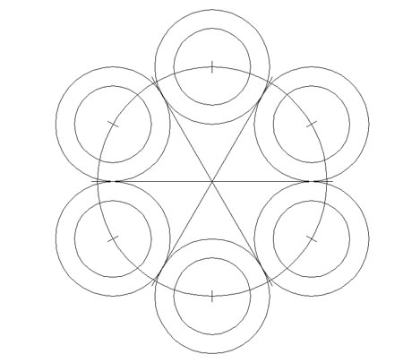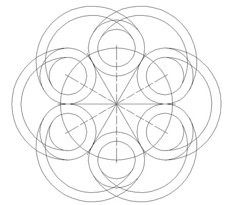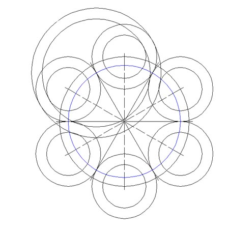 Un momento decisivo. Tenemos que localizar una nueva circunferencia concéntrica a la primera que hemos dibujado, pero cuyo radio sea hasta los puntos de tangencia del primer grupo de circunferencias que hemos dibujado. Para distinguirlo, lo he pintado en color azul. Esta nueva circunferencia nos va a definir los centros de los siguientes arcos, que irán tangentes exteriores a cada grupo de dos circunferencias consecutivas, tanto interiores, como exteriores.