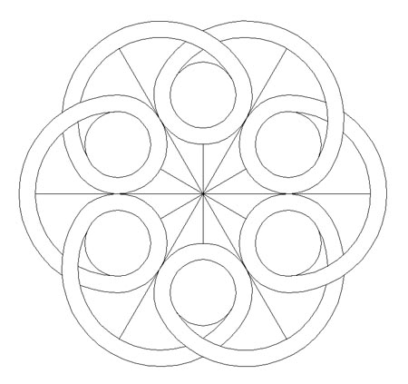 Por último, borraremos el trocito de arco de las pequeñas circunferencias interiores para conseguir la forma de "almendras" y añadiremos, de forma opcional pequeños arcos complementarios para enriquecer el dibujo. Terminaremos cerrando con dos grandes circunferencias todo el contorno, cuidando de mantener el tamaño de la "calle".